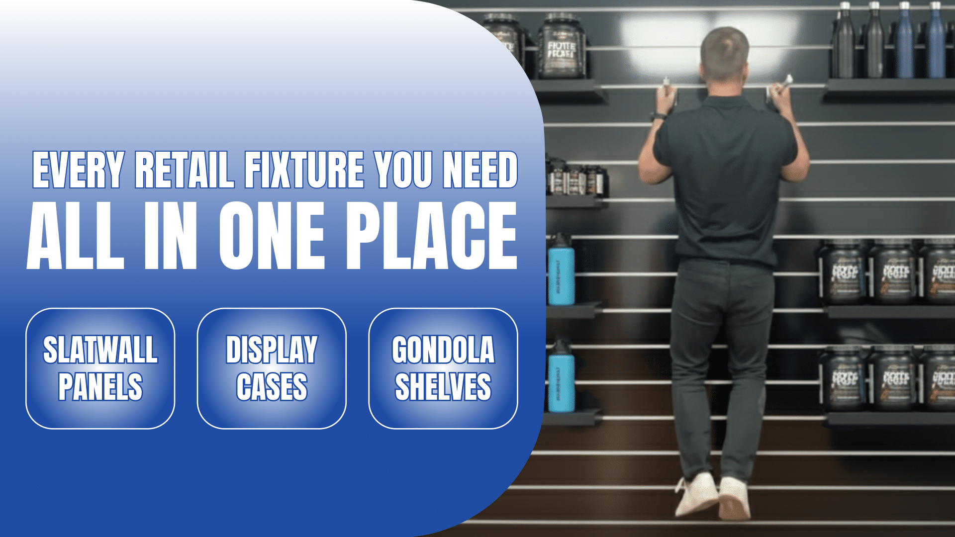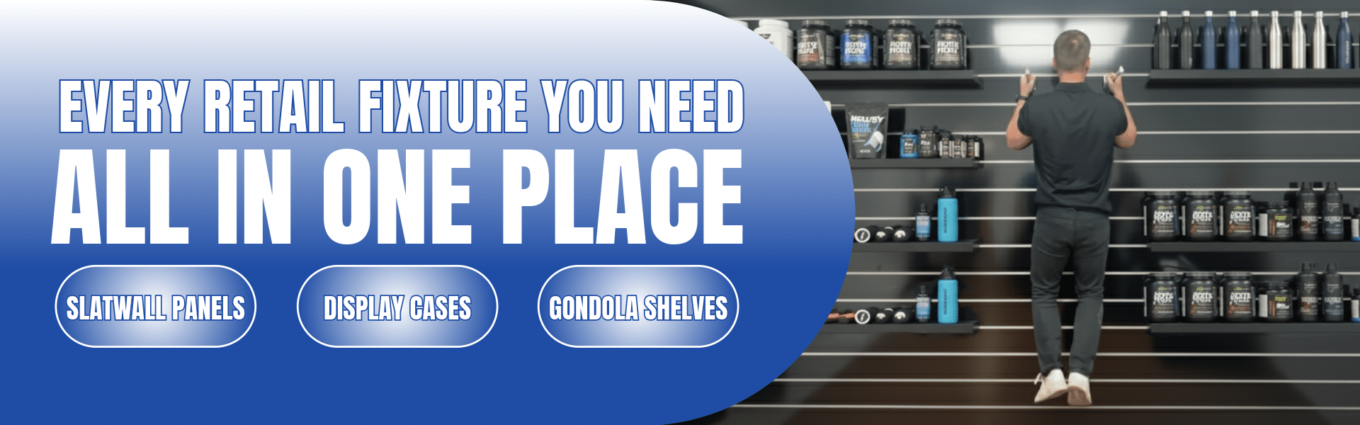 Displayarama specializes in retail fixtures and store displays, including slatwall panels, retail display cases, gondola shelving, gridwall panels, mannequins, and related fixtures and accessories. These products are used to build out entire stores, from perimeter walls and center aisles to front counters and feature displays.