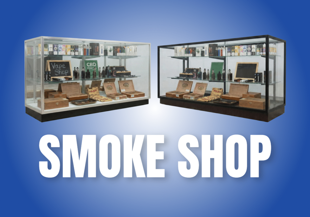 Smoke shops and vape stores usually purchase full vision or extra vision display cases, slatwall panels, and countertop fixtures to organize glass, vapes, and accessories.