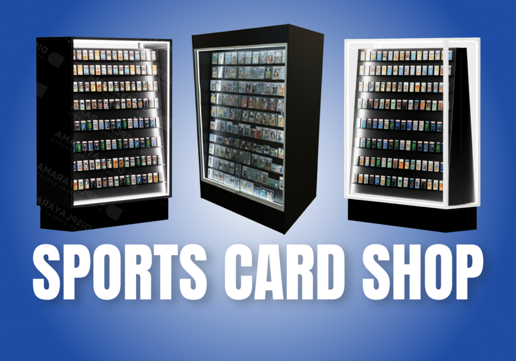 Trading card and hobby shops use retail display cases, wall cases, and slatwall or gridwall to feature sealed product, single cards, and accessories in a secure, organized way.