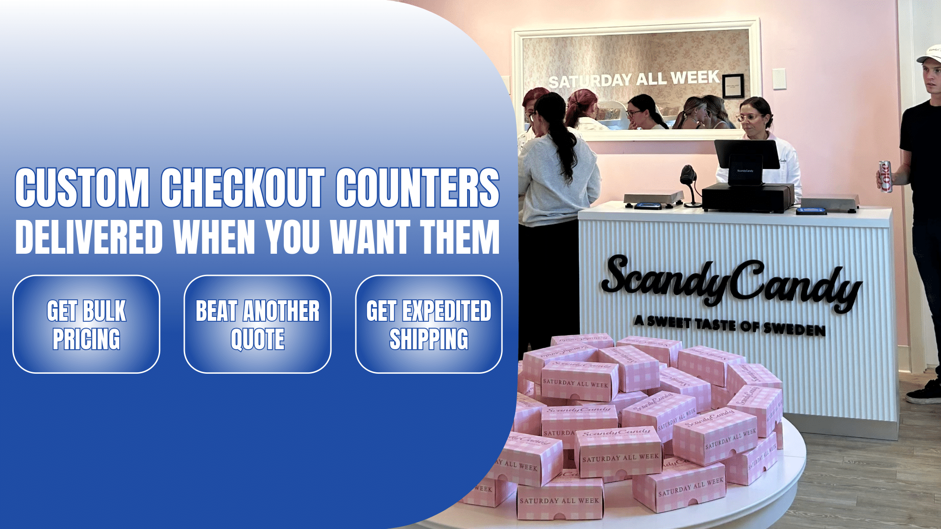 Once we’ve covered all the details. we will show you a 3D model of what the checkout counter will look like. Once the design is approved, we will create it in real life.