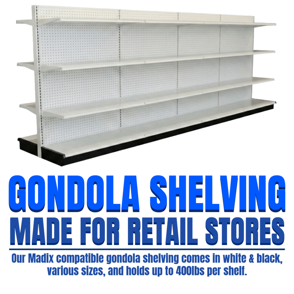 Our gondola shelves are built from heavy-duty metal. Each shelf can typically hold up to 500 pounds of evenly distributed weight, depending on shelf depth and configuration. For heavier products, such as bulk items or hardware, we recommend double-checking load capacity when designing your setup. Our team can help you determine the best configuration for your store’s specific needs.