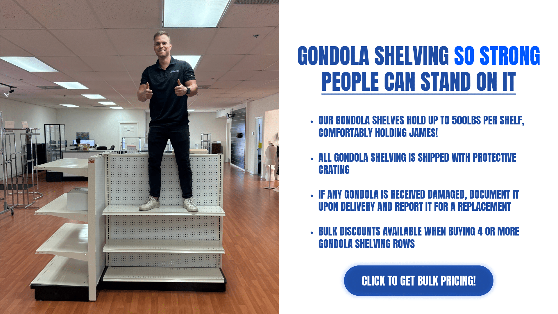 Our gondola shelves are built from heavy-duty metal. Each shelf can typically hold up to 500 pounds of evenly distributed weight, depending on shelf depth and configuration. For heavier products, such as bulk items or hardware, we recommend double-checking load capacity when designing your setup. Our team can help you determine the best configuration for your store’s specific needs.