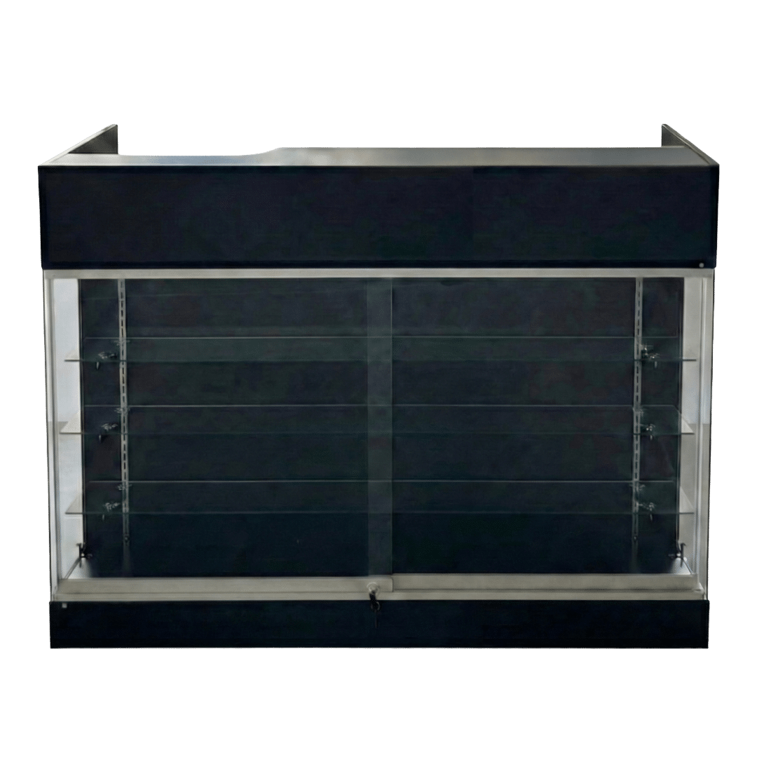 Glass Front Cash Wrap that is easy to assemble. This black retail counter works perfect for any retail store.