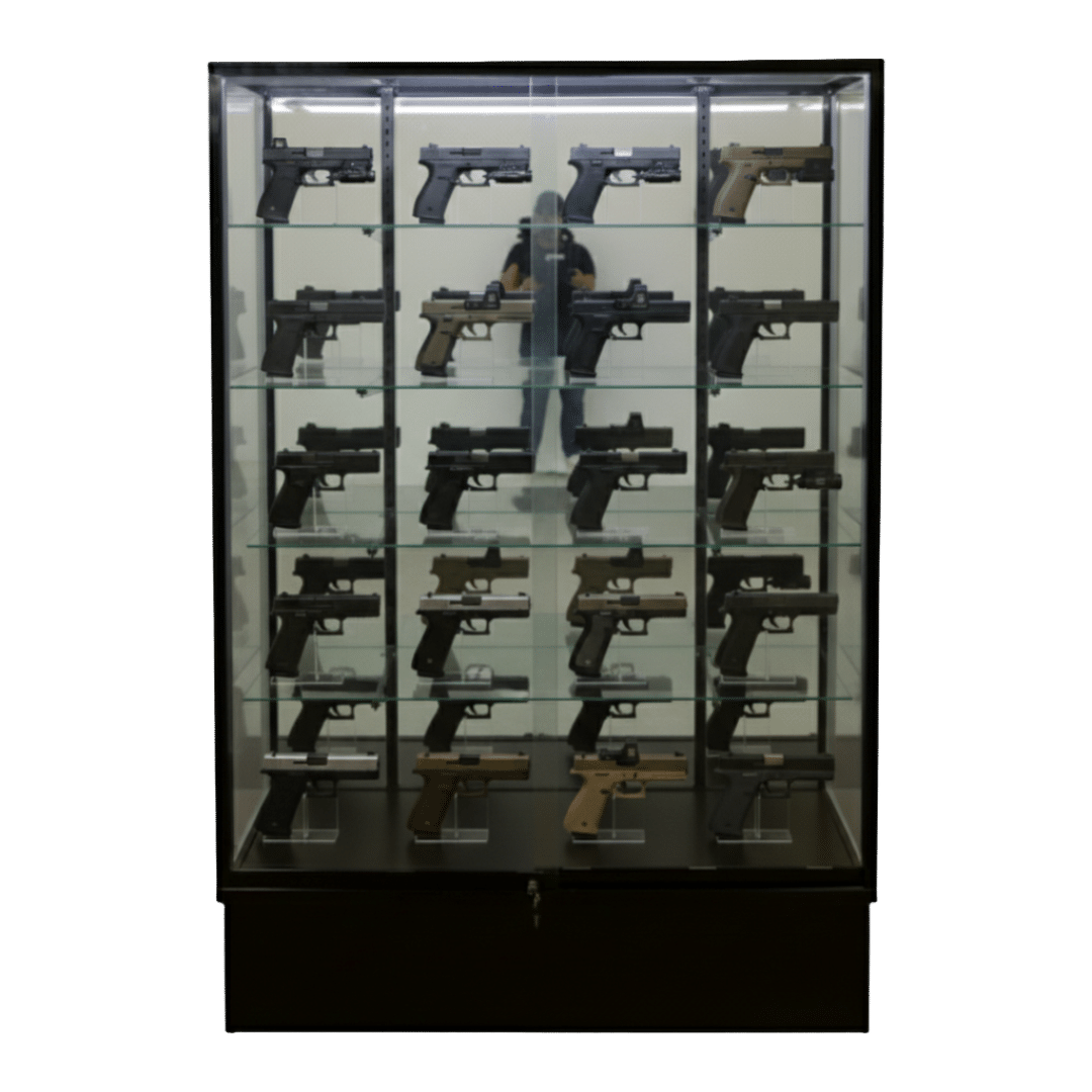 Premium Mirror Back Gun Display Case with a sleek black aluminum frame and tempered safety glass, designed to showcase high-end merchandise while ensuring security and durability. Featuring a glass back panel, sliding doors, and adjustable glass shelves, this gun display case is ideal for gun stores.