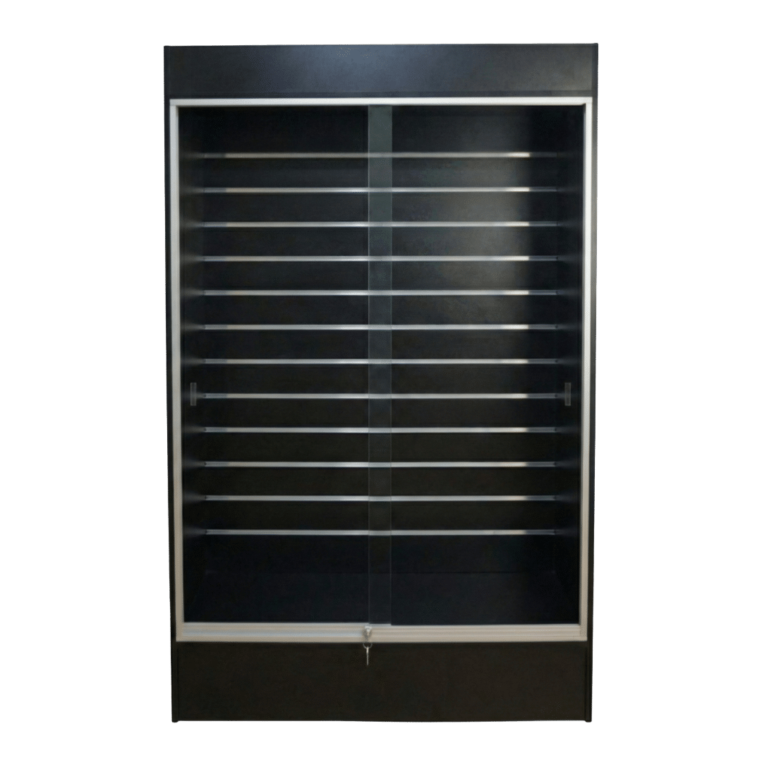 Black Wall Display Case – Full View, Glass Sliding Doors with push lock, five (5) 12″ glass adjustable shelves, color matched slatwall back panel. LED down-lights included. 48″L X 18″W X 78″H.