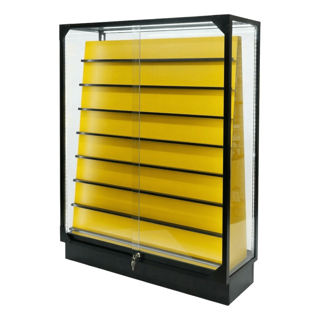 This sports card display case features a Black base, black frame, and yellow insert, cards to be viewed from the front and back. Built with security and visibility in mind, it provides a reliable way to showcase and protect your collection.