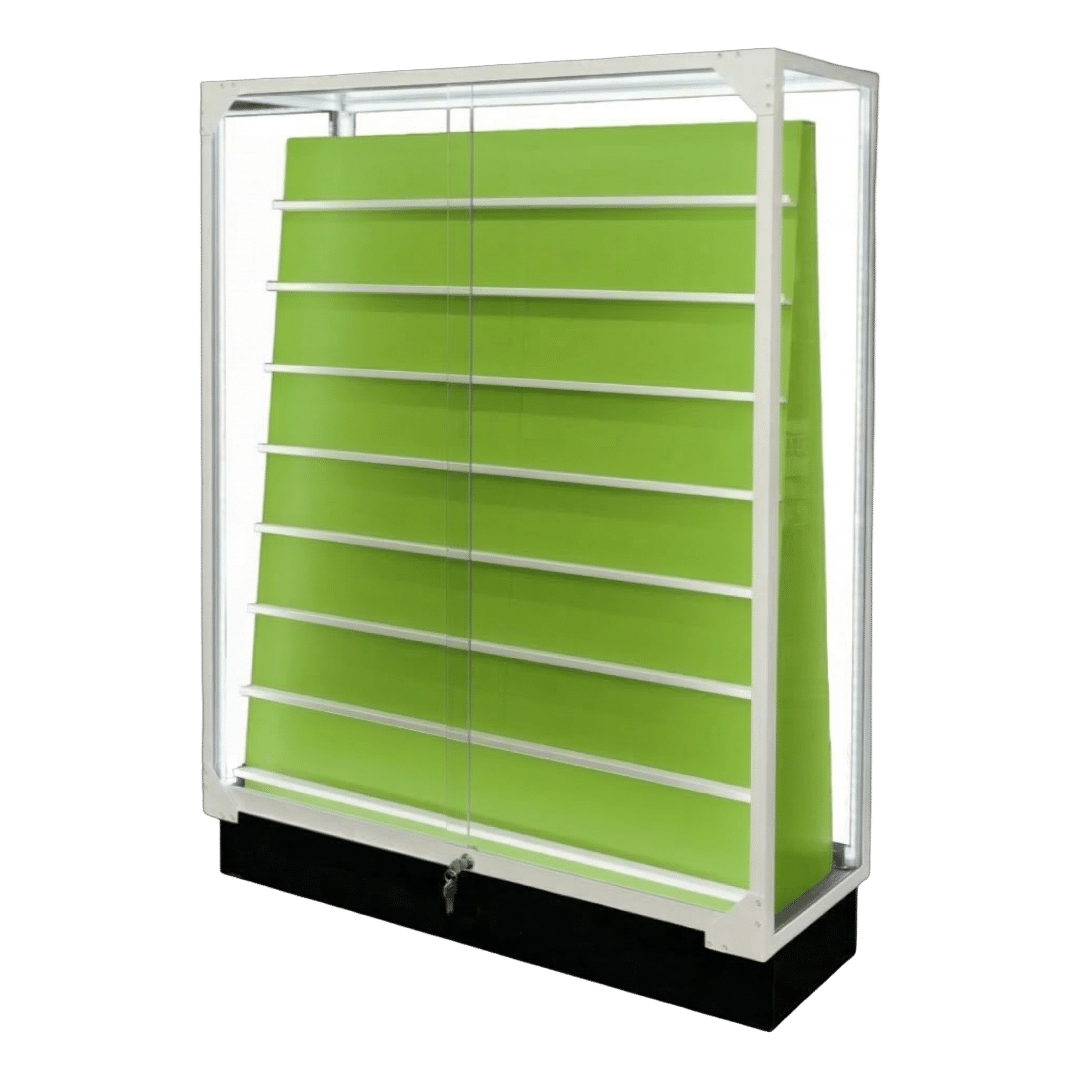 This sports card display case features a Black base and white frame with green insert, cards to be viewed from the front and back. Built with security and visibility in mind, it provides a reliable way to showcase and protect your collection.