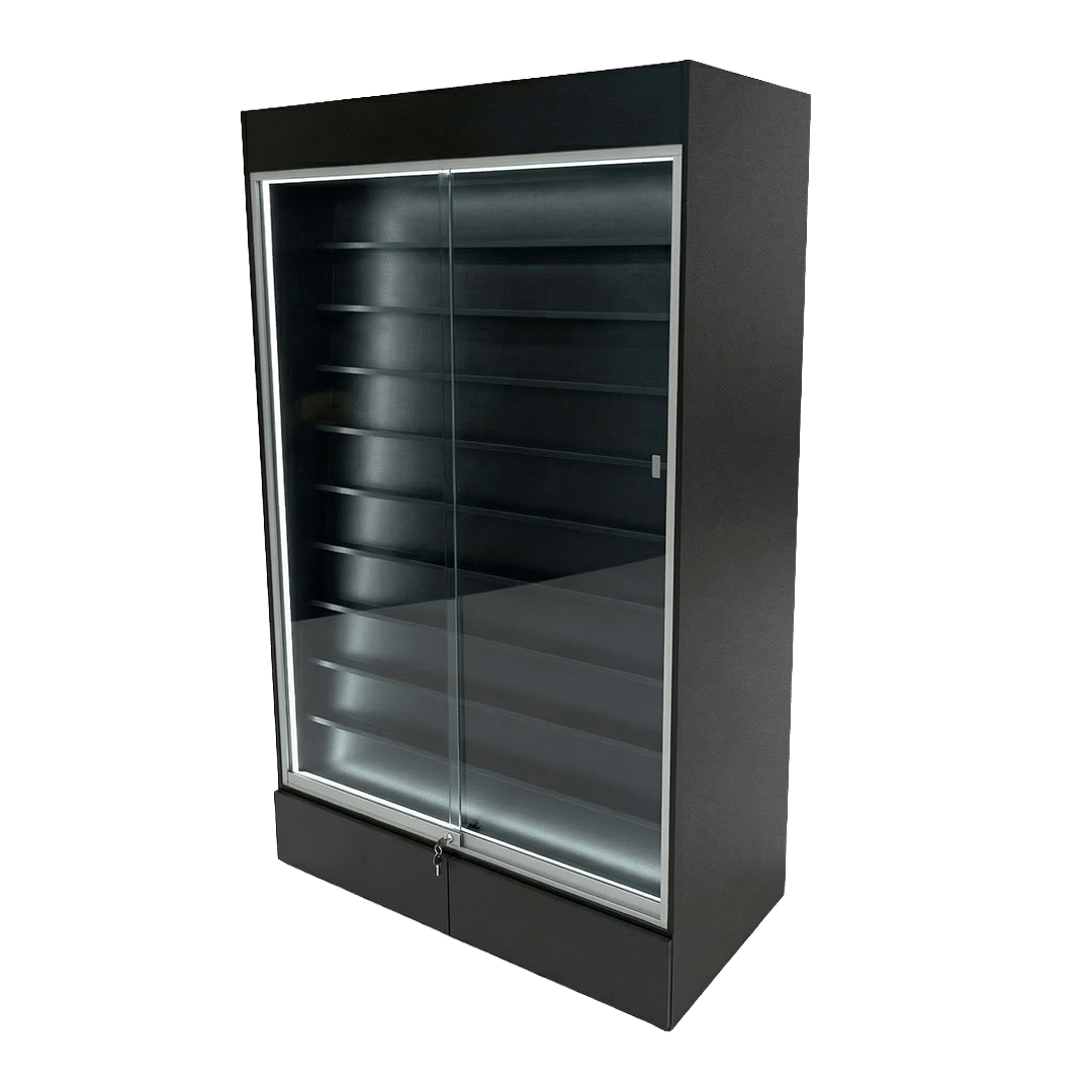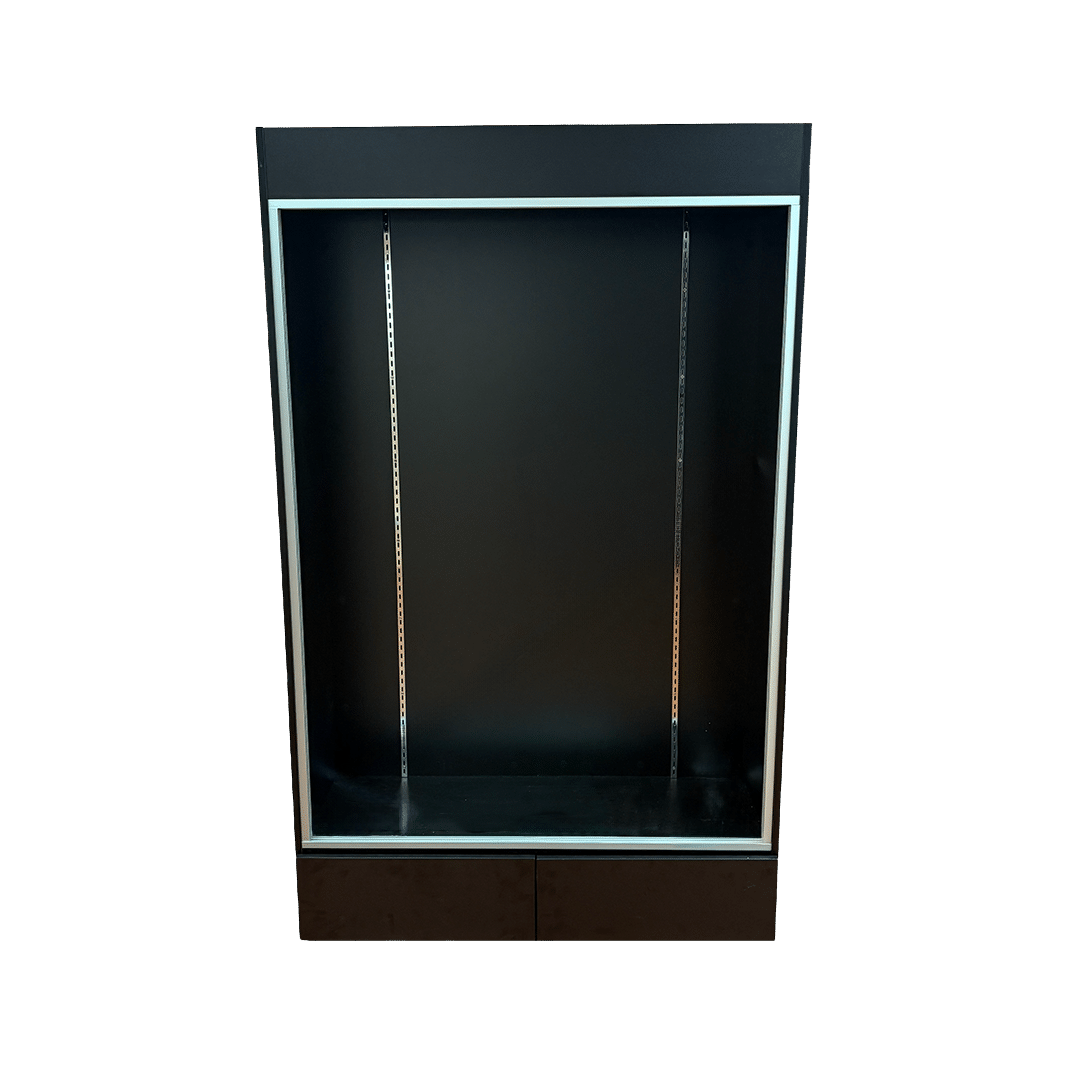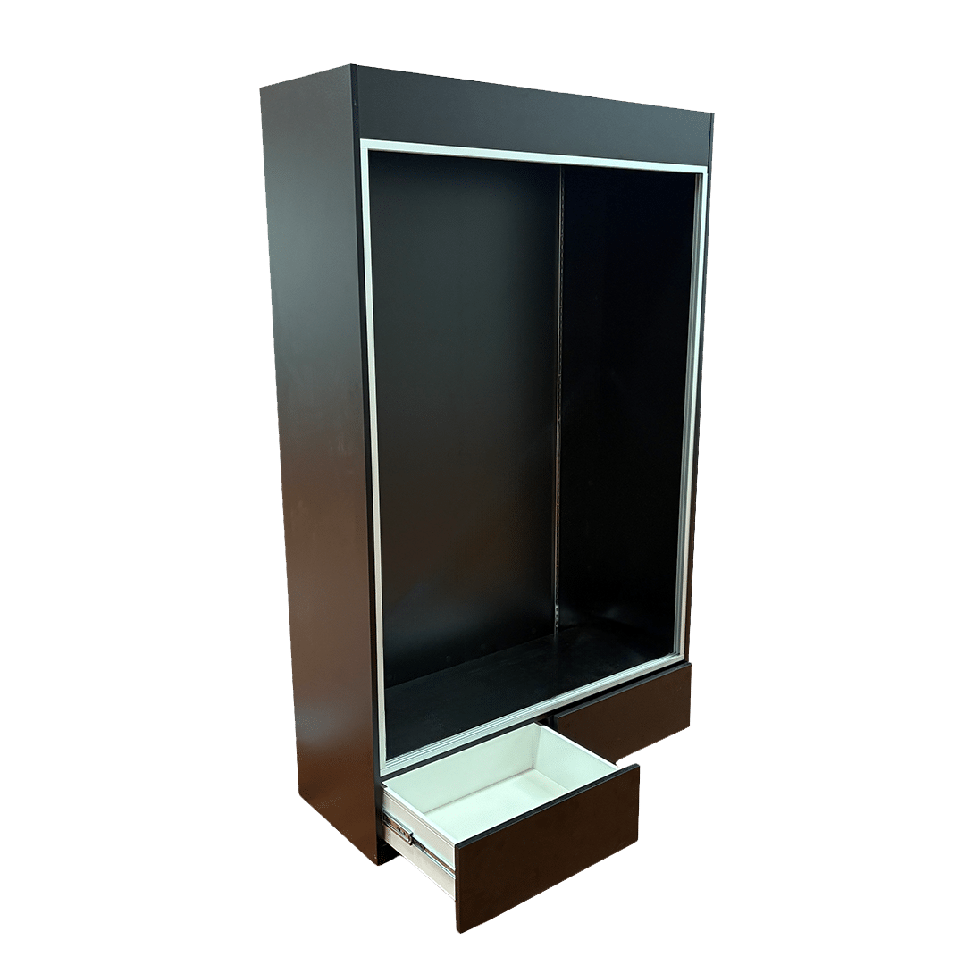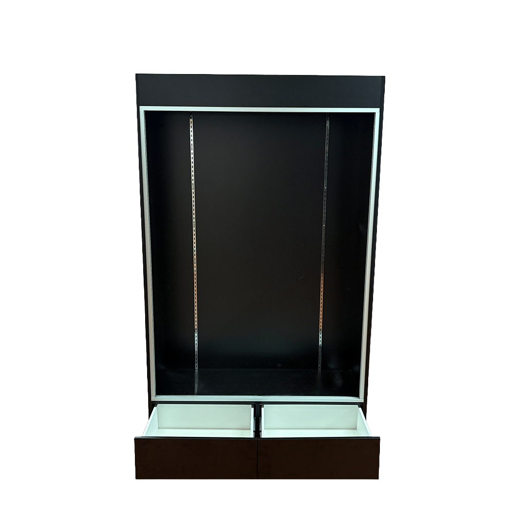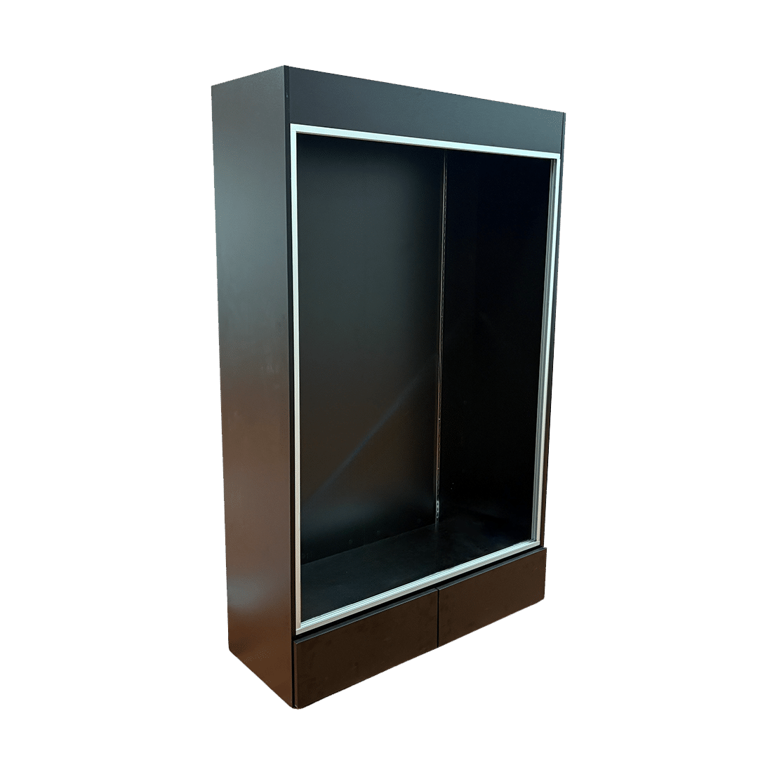This sports card display case features a Black base and frame with 2 drawers, cards to be viewed from the front. Built with security and visibility in mind, it provides a reliable way to showcase and protect your collection.