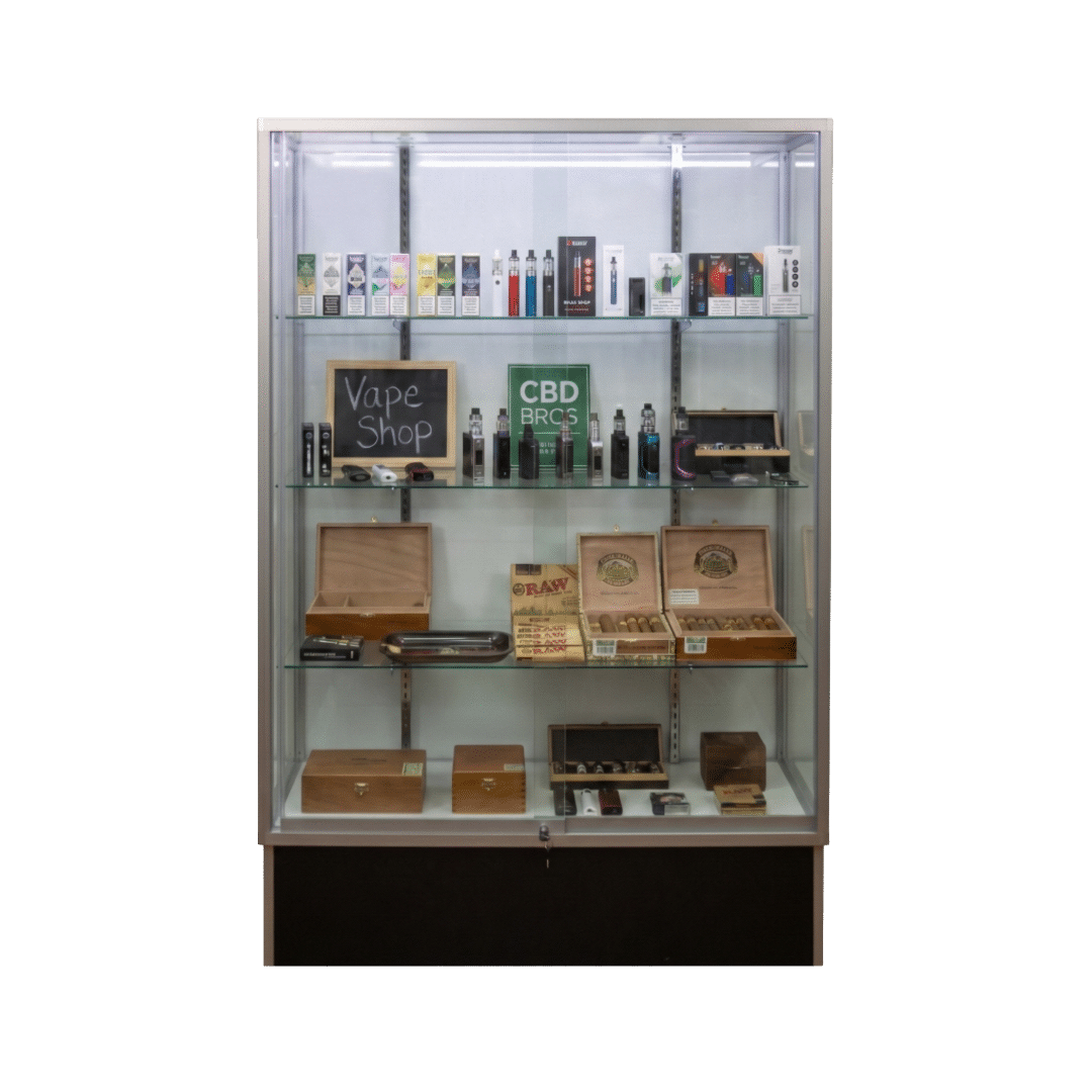 Our premium sliver smoke shop wall display case with a sleek silver aluminum frame and tempered safety glass, designed to showcase high-end merchandise while ensuring security and durability. Featuring a glass back panel, sliding doors, and adjustable glass shelves, this display case is ideal for smoke shops.