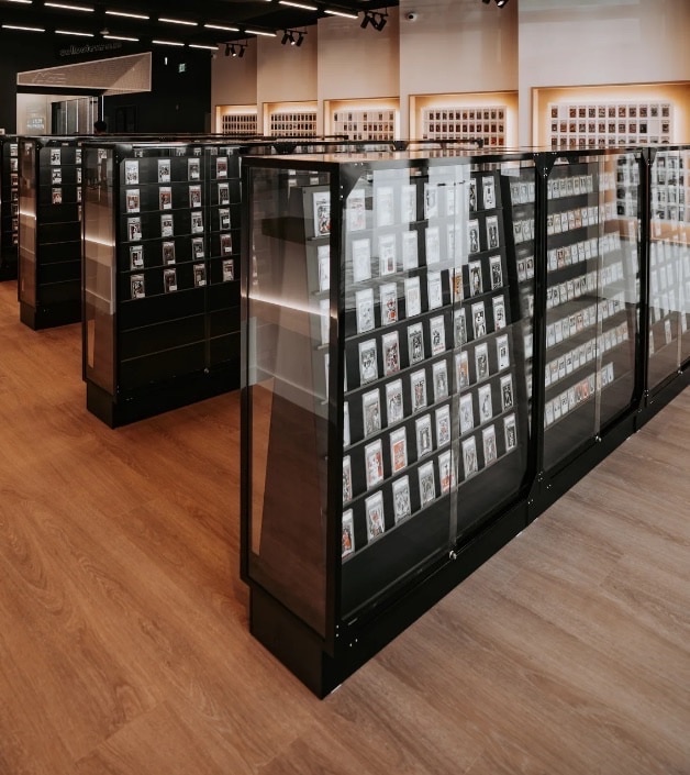 Sports Card Wall Display Case | White | Wall Edition | with LED $1,250.00 Sports Card Display Case | Black | Double Sided Aisle Edition | with LED