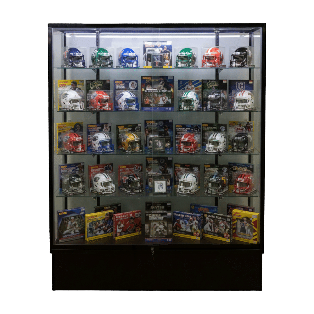 Our premium 60″ wide sports memorabilia display case with a sleek black aluminum frame and tempered safety glass, designed to showcase high-end merchandise while ensuring security and durability. Featuring a glass back panelsliding doors, and adjustable glass shelves, this display case is ideal for retail stores, museums, galleries, and collectible showrooms.