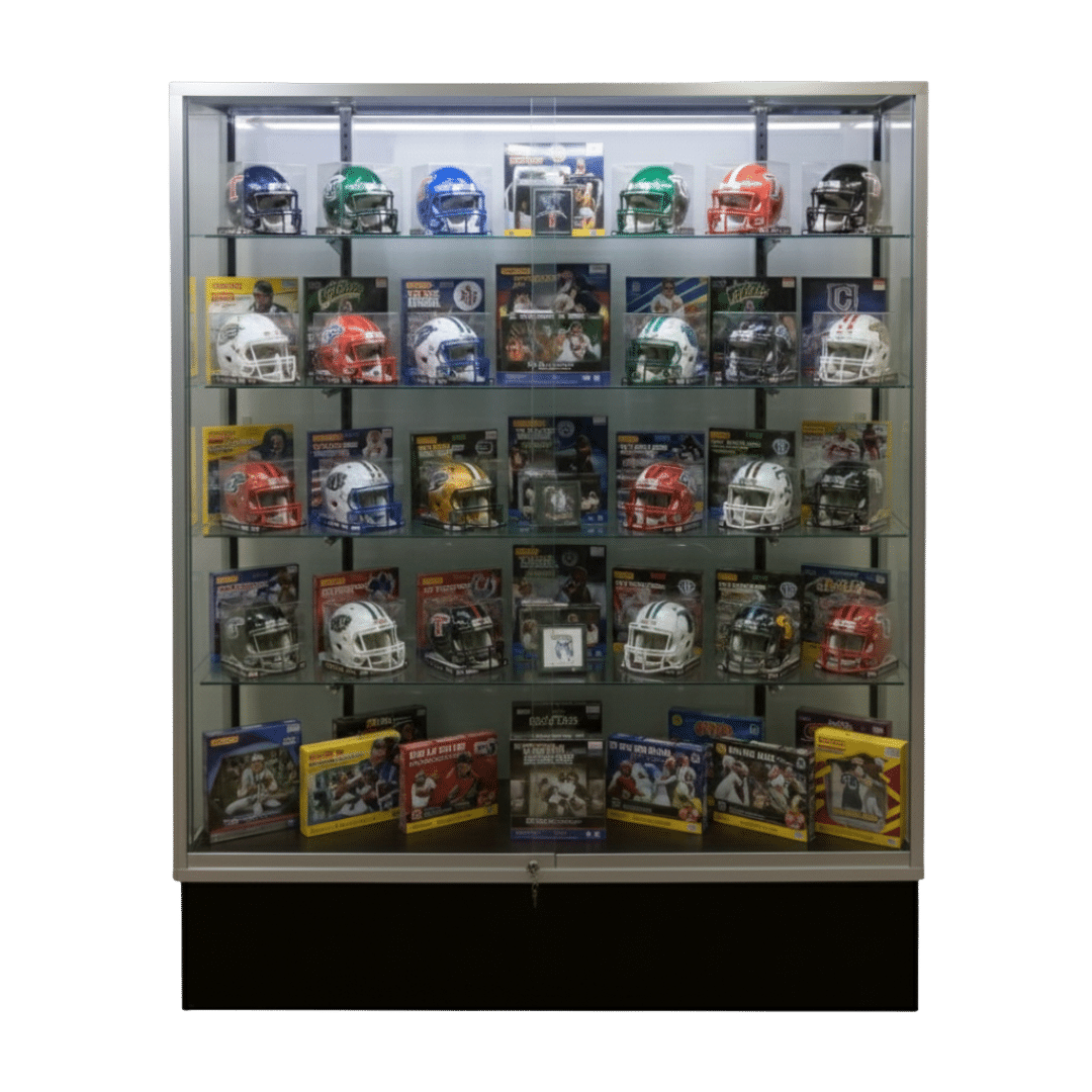Our premium 60″ wide sports memorabilia display case with a sleek Silver aluminum frame and tempered safety glass, designed to showcase high-end merchandise while ensuring security and durability. Featuring a glass back panel, sliding doors, and adjustable glass shelves, this display case is ideal for retail stores, museums, galleries, and collectible showrooms.