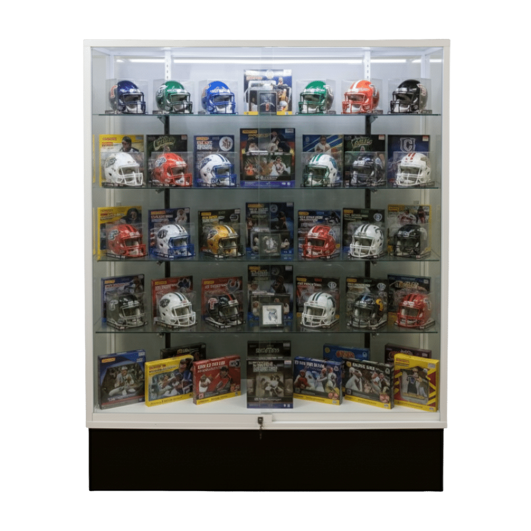Our premium 60″ wide sports memorabilia display case with a sleek white aluminum frame and tempered safety glass, designed to showcase high-end merchandise while ensuring security and durability. Featuring a glass back panel, sliding doors, and adjustable glass shelves, this display case is ideal for retail stores, museums, galleries, and collectible showrooms.