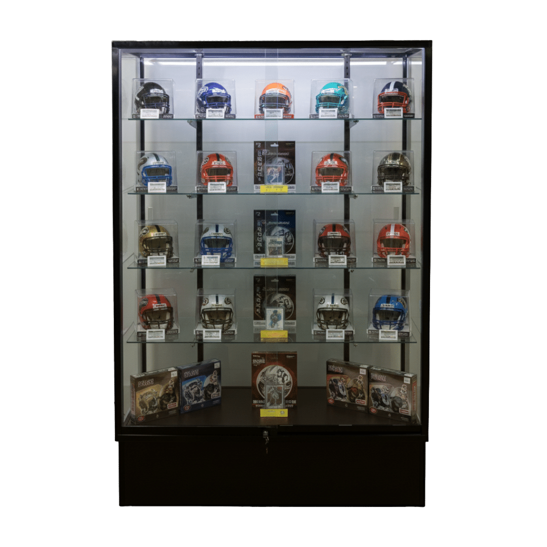 In any given display case, it is recommended to use good judgement. We have seen people in all sort of industries display products in our display cases. From guns, to hardware, sports cards, paint supplies, gaming stores, tobacco shops, clothing stores, jewelry stores, pawn shops, and the many other niches we work with – we have not gotten phone calls back about a shelf breaking due to weight.