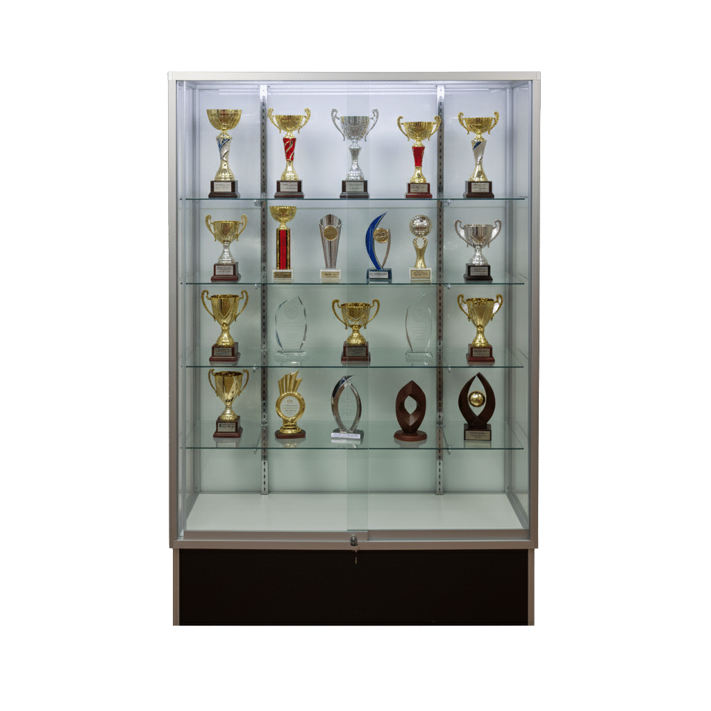 A premium trophy case with a sleek silver aluminum frame and tempered safety glass, designed to showcase high-end merchandise while ensuring security and durability. Featuring a glass back panel, sliding doors, and adjustable glass shelves.