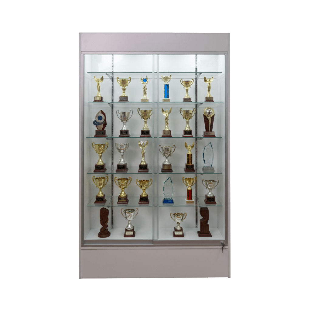White Full Vision Trophy Case, Glass Sliding Doors with push lock, five (5) 12″ glass adjustable shelves, color matched back panel. LED down-lights included. 48″L X 18″W X 78″H.