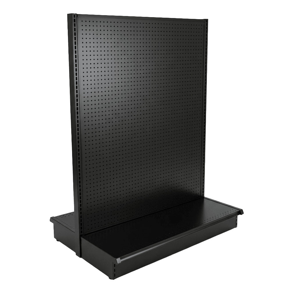 Traditional gondola shelving is constructed from powder-coated steel, ensuring long-lasting durability and resistance to daily wear. Most gondolas feature pegboard back panels that allow for hooks or bracket-mounted shelving. Some modern systems use slatwall panel backs for a more cleaner, flexible display solution—but pegboard backs remain the retail standard.