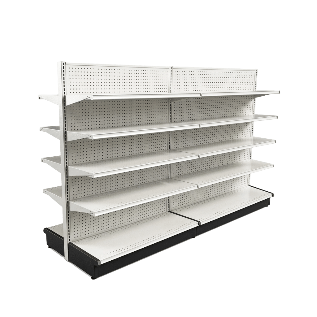 Gondola shelving is a freestanding retail display fixture made of durable metal with a flat base and vertical back panels. It’s commonly used in supermarkets, convenience stores, and hardware shops to neatly showcase a variety of products. The shelves attach to notched uprights, allowing you to easily adjust heights and configurations. Most gondola units feature pegboard backs for use with hooks and accessories, though some styles include solid backs or slatwall panels for a more custom look.