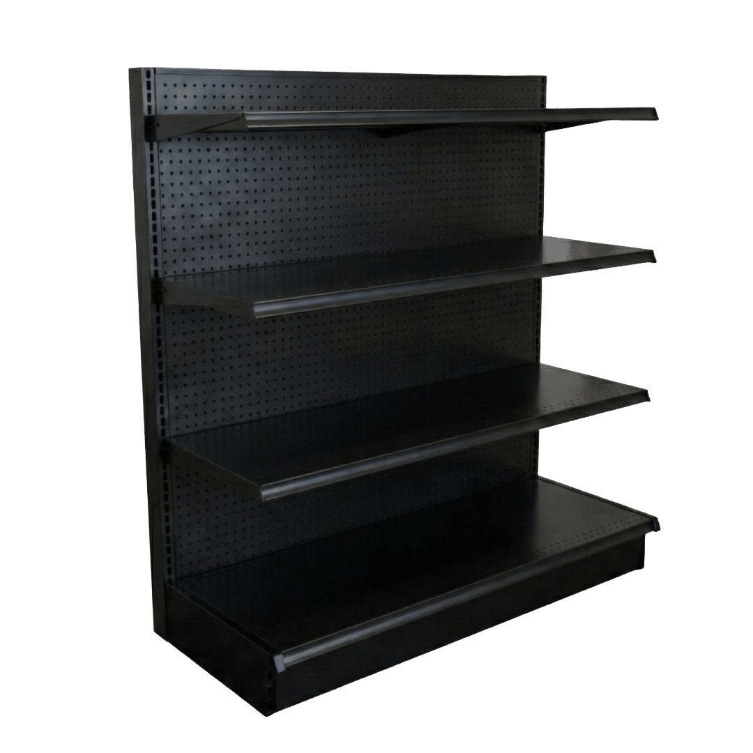 Gondola shelving is a freestanding retail display fixture made of durable metal with a flat base and vertical back panels. It’s commonly used in supermarkets, convenience stores, and hardware shops to neatly showcase a variety of products. The shelves attach to notched uprights, allowing you to easily adjust heights and configurations. Most gondola units feature pegboard backs for use with hooks and accessories, though some styles include solid backs or slatwall panels for a more custom look.