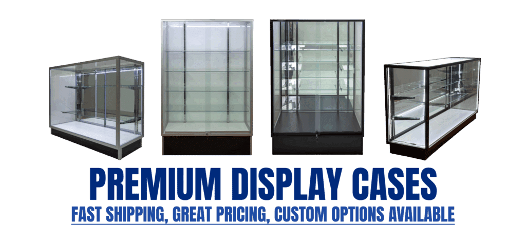 Our display cases come in 2 styles. Each style is a different size. The full vision display cases come in 48” x 18” x 38”, 70” x 18” x 38”, and 48” x 18” x 78”. The extra vision display cases come in 48” x 20” x 38”, 70” x 20” x 38”, and 48” x 20” x 72”.